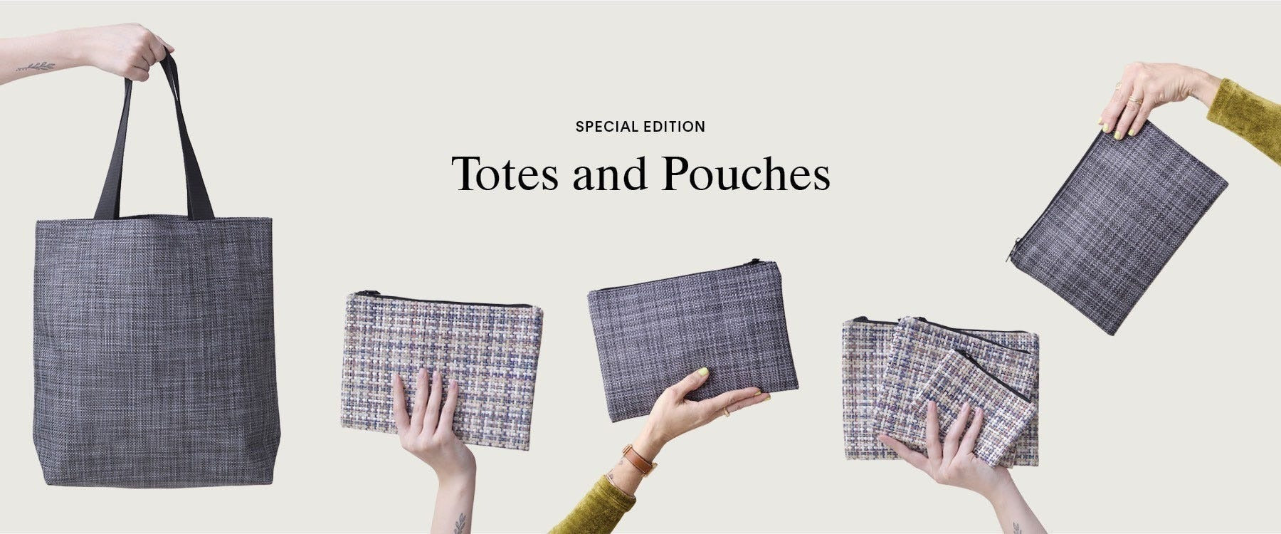 Available exclusively on chilewich.com. Keep essentials close at hand with roomy totes and sleek zippered pouches crafted from our signature textiles. Lightweight, durable, and easy to clean, these woven wonders are bound to go fast. Get them while they last.